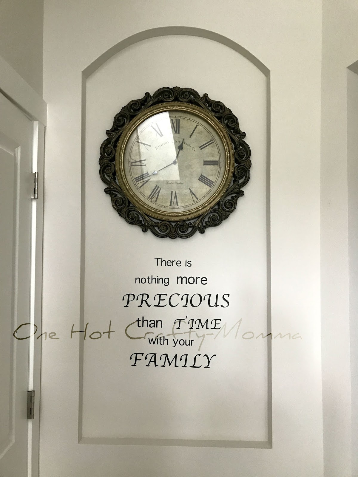 So we bought our house in March and have been having tons of fun doing little projects and decorating it. I can't wait to show you things that we have done!! Here is one little project that we did. We had this little inset that you see right when you come in the front door. It took us a little bit but we finally decided what we wanted to do in that spot. This is what we came up with and I couldn't be more excited about it. I cut out the lettering on my Cricut and then hung the clock.